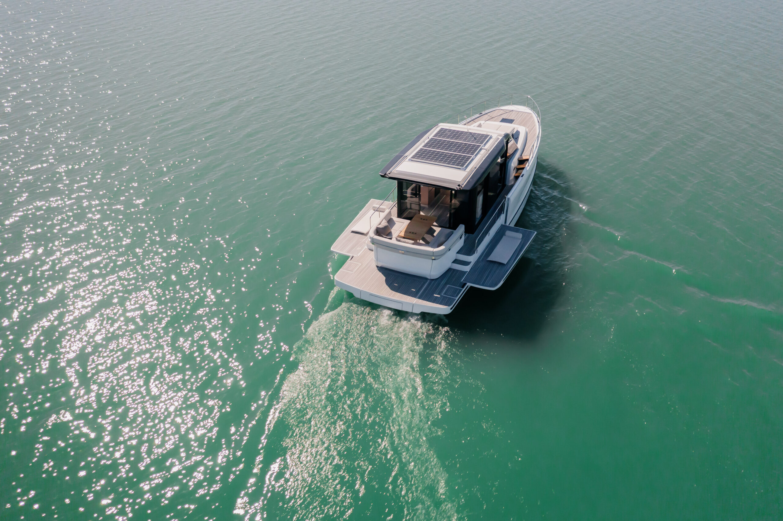 Solarpaneele auf dem Dach unterstützen die Energieversorgung und machen die WIA 520 Elektroyacht zu einem der fortschrittlichsten und umweltfreundlichsten Boote ihrer Klasse. Das intelligente Energiemanagement sorgt dafür, dass Strom effizient genutzt und bei Bedarf schnell über Landanschlüsse geladen werden kann.
