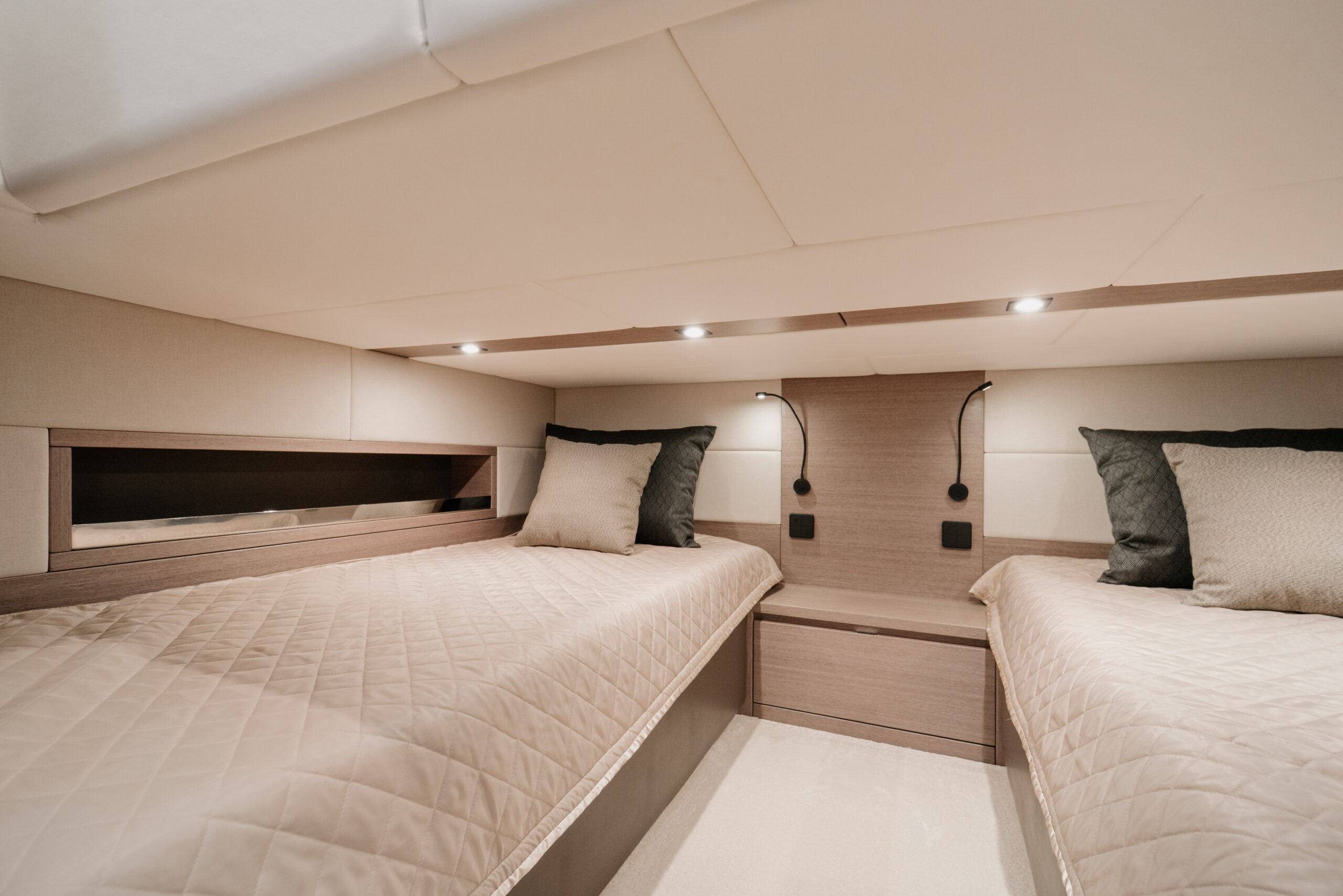 Im Inneren der WIA 520 Elektroyacht befinden sich bis zu drei individuell konfigurierbare Kabinen mit hochwertigen Betten, Eigner- und Gäste- Nasszellen mit elektrischen Toiletten und Duschen.