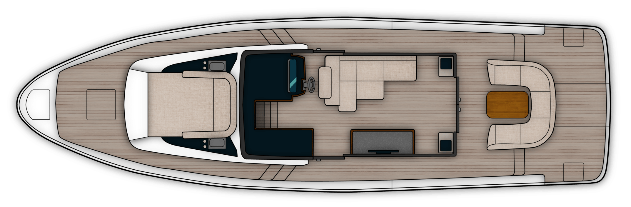 Die OPEN Version richtet sich an die Eigner, die sich draußen aufhalten und großzügige Sitz- und Liegeflächen wünschen. Ideal sind die Reviere im Mittelmeer, die Seen in der Schweiz, Italien oder Frankreich.